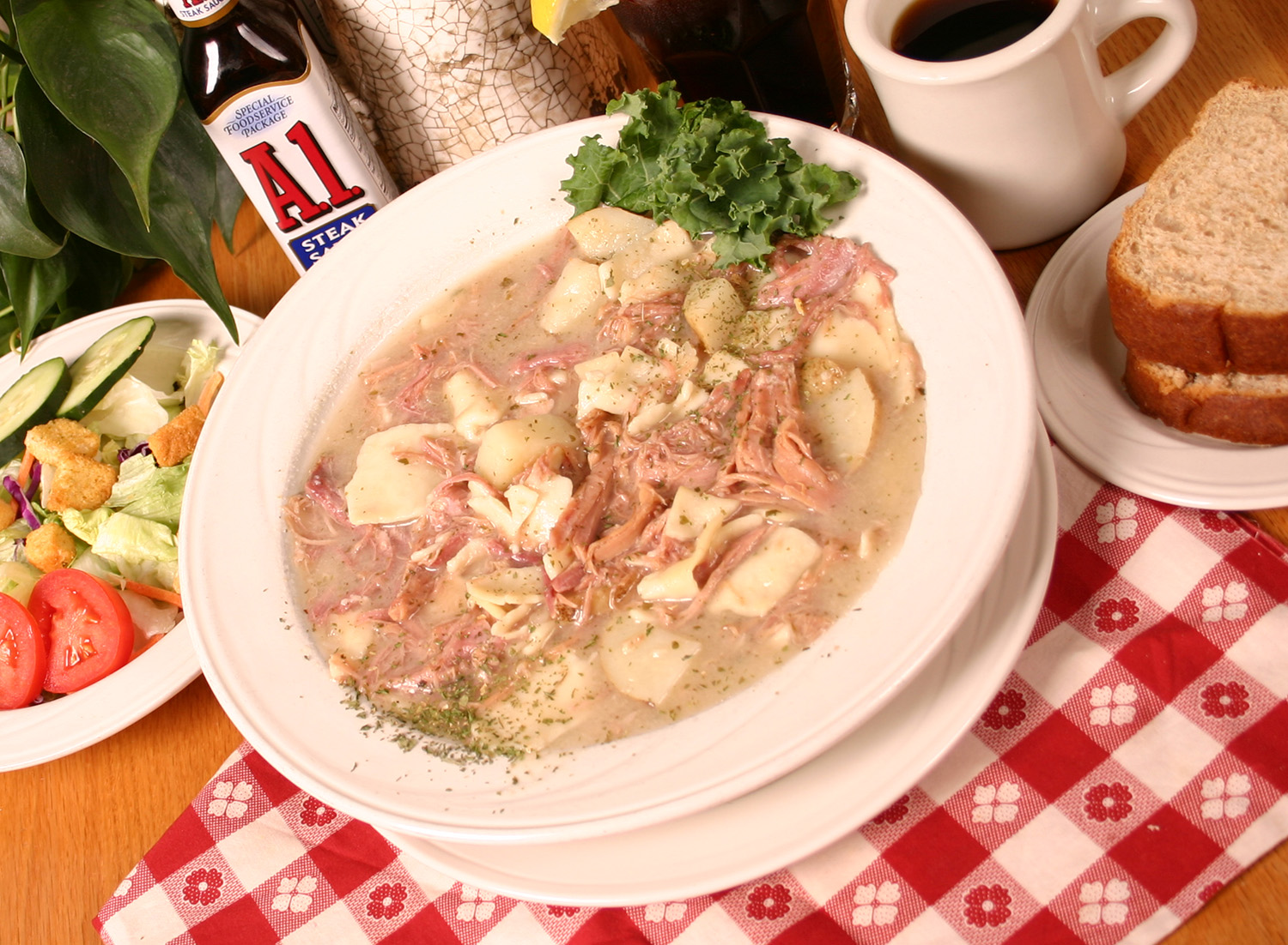Thick homemade pot pie noodles, potatoes, and ham served in our savory broth.