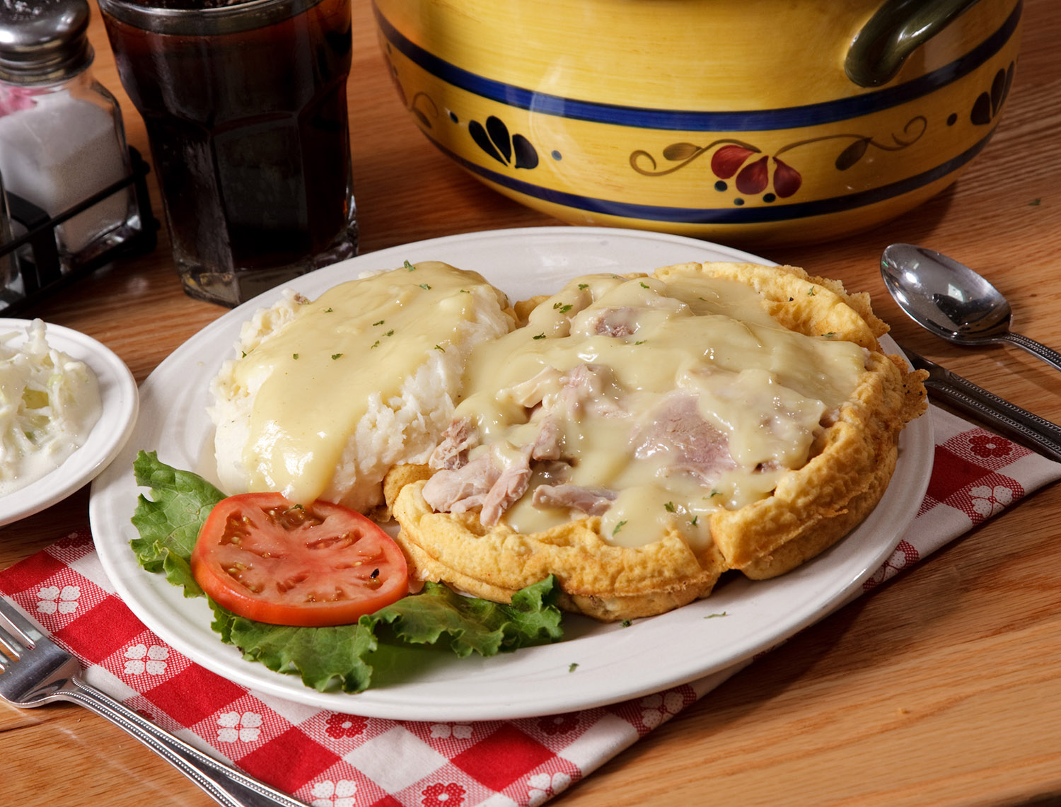 Chicken and waffle served with fresh homemade waffle, topped with boneless chicken & gravy.!